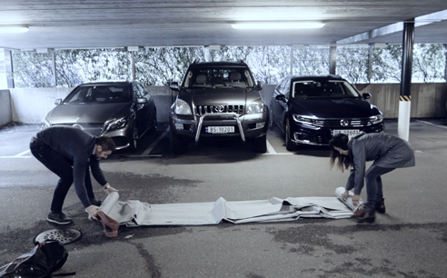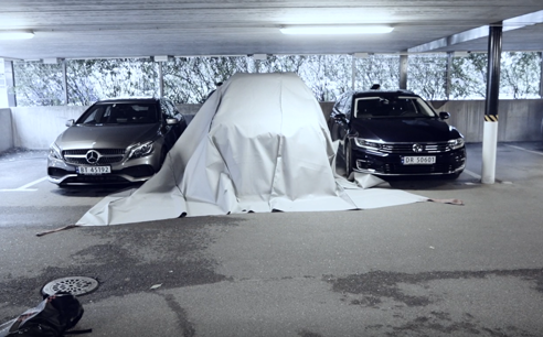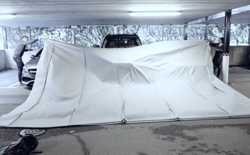 Take the handles and pull the fire blanket over the car in one continuous movement.