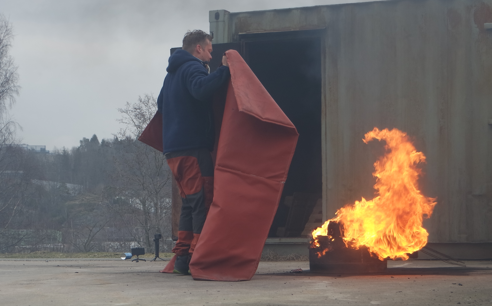 Make sure the fire blanket is tight around the burning battery to stop any fire from spreading.